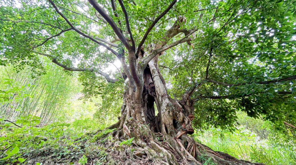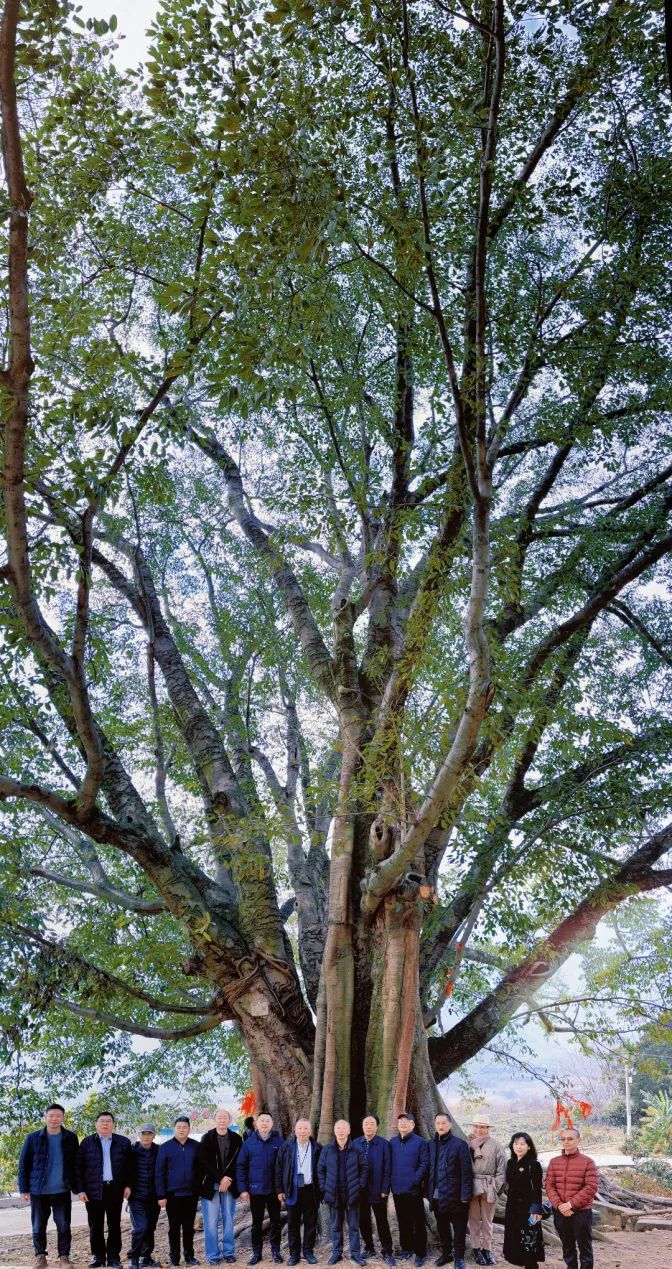 ? ? ? ?古樹資源也是海花溝的一大特色。項目范圍內有近200棵數百上千年的古樹沿主要道路呈帶狀分布,專家一行參觀的是園區的“千手觀音子母樹”和“七星古樹”。子母樹為同根而生的雙生樹,母樹根系在十余米外再次萌芽,生長為子樹。二者根系相連、枝葉相接、風姿相似,因母樹枝干如手臂向四周伸展,神似千手觀音,故被當地村民稱為“千手觀音子母樹”。“七星古樹”因生長方位分別與北斗七星——天樞、天璇、天璣、天權、玉衡、開陽、瑤光對應,故此得名。每年農歷三月三,七里八鄉的村民在此舉行“斗菜節”,祭祀樹神祈福新年。